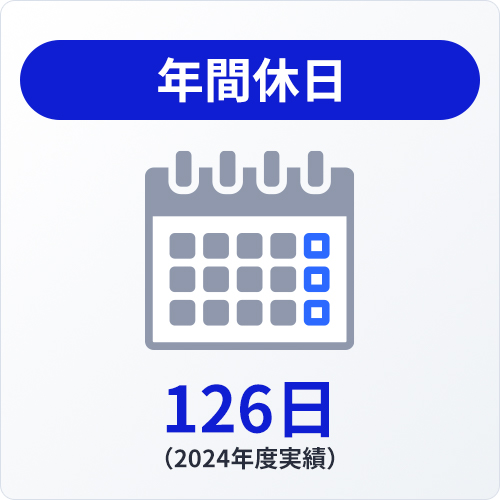 | 休日・休暇 | 【休日】 年間休日数126日(2024年度実績) 週休2日制、祝日、メーデー、夏季、年末年始、特別休日 ほか 【休暇】 ・年次有給休暇(最大年間22日、繰り越し分含め最大44日) ・ファミリーフレンドリー休暇(初年度5日、繰り越し分含め最大20日) ※年次有給休暇とファミリーフレンドリー休暇は半日休暇制度有、時間単位での取得も可 結婚休暇、産前産後休暇制度、忌引休暇、特別休暇、リフレッシュ休暇(満30歳:5日、40歳:7日、50歳:10日) |