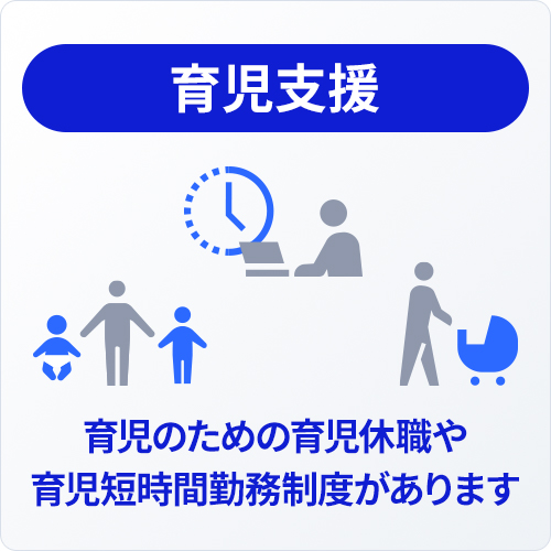 | 育児支援 | 育児のための育児休職や育児短時間勤務制度があります。 |