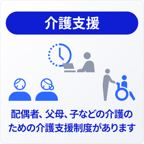 | 介護支援 | 配偶者、父母(配偶者の父母を含む)、子などの介護のための介護休職や介護短時間勤務制度があります。 |