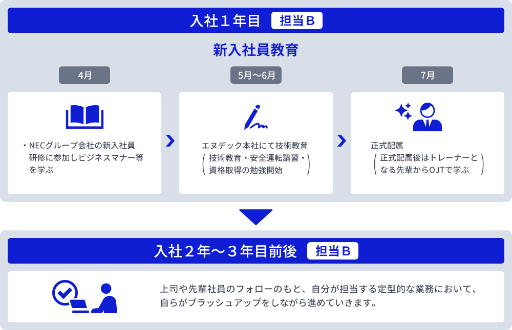 まずは3~6ヶ月の新入社員教育からスタートします。最初は社会人のルールや考え方、ビジネスマナーから。技術研修に入ると電気設備の基本技術や作業プロセスを座学だけでなく、先輩社員と現場に出て経験する実地研修で正しい知識を身につけていきます。また「電気工事士」等の国家資格取得に向けての対策講座に参加し、早期資格取得に向けた準備をスタートします。配属後は先輩社員について、一連の業務を教えてもらいながら一つひとつ習得していきます。その後は習熟度に応じてアドバイスを受けながら一人で業務を担当していきます。