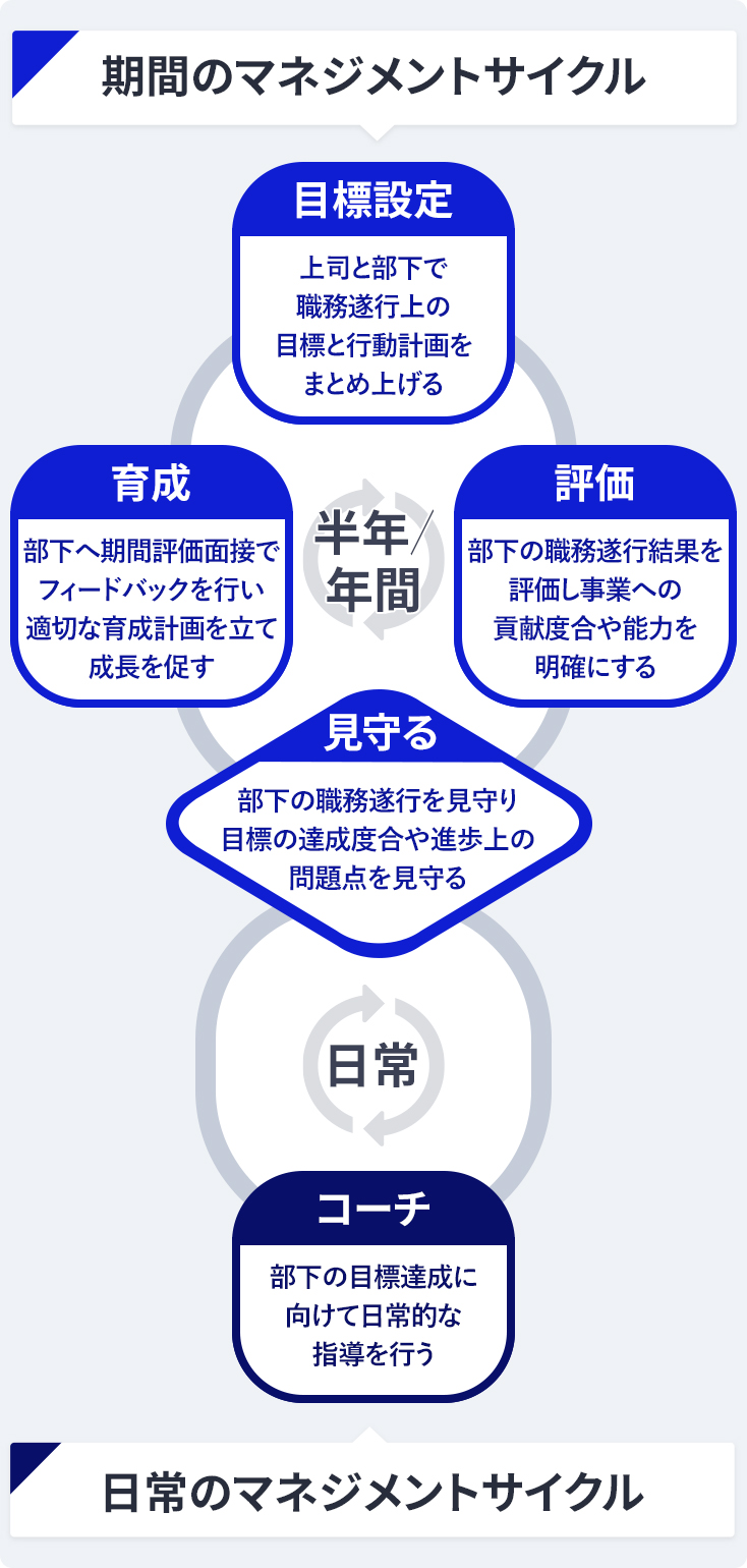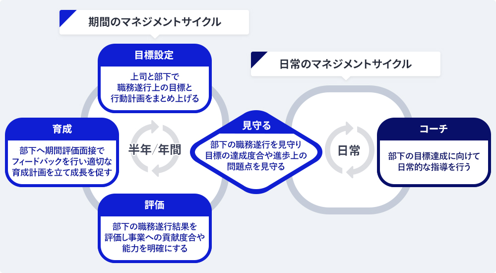 上司は設定した目標の遂行度合いについて、日々見守って適宜コーチングを行い、