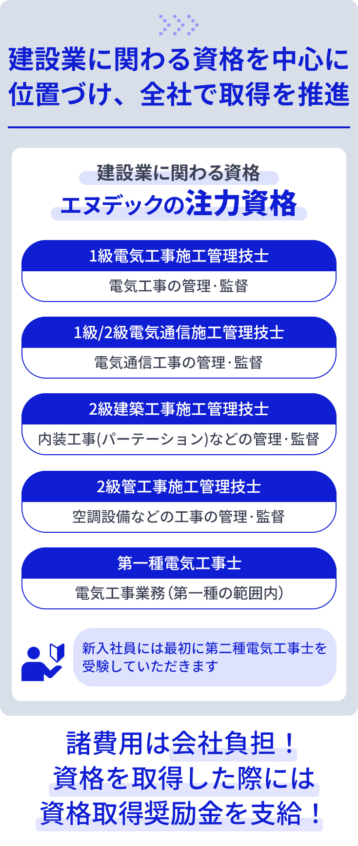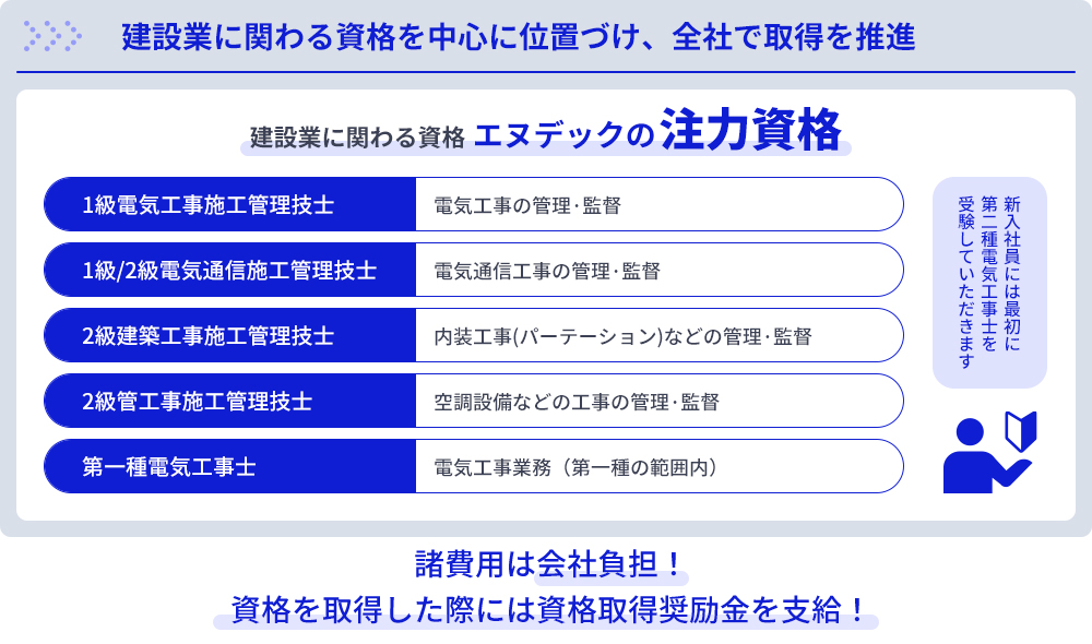 電気や電気通信などの現場管理を行うにあたり、「施工管理技士」等の資格保有者でないと対応できない仕事があります。エヌデックでは推奨する資格取得に向けたサポート体制を整えています。