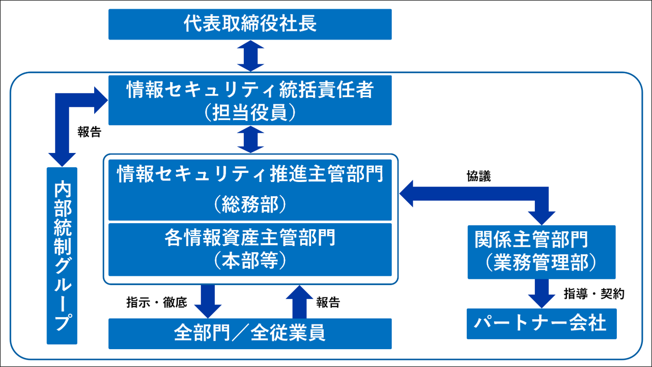 当社では、「情報セキュリティ管理体制」を整備し、紛失や漏えい等の情報セキュリティに関するリスクの発現化防止に努めています。